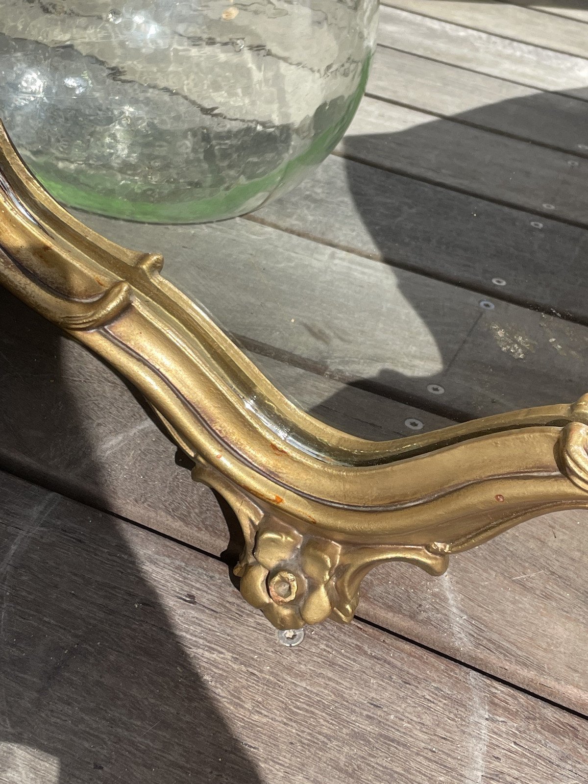 Les traces anciennes sur ce miroir témoignent de son histoire, ajoutant un charme unique qui ne manquera pas de captiver les amateurs de décoration vintage. Chaque imperfection est un rappel du passé, faisant de ce miroir une pièce à la fois décorative et chargée d’émotion.
